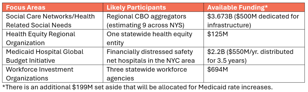 Within the waiver, there are four key focus areas that will receive funding; Social Care Networks (SCNs)/Health Related Social Needs (HRSN), Health Equity Regional Organization, Medicaid Hospital Global Budget Initiative, and Workforce Investment Organizations.